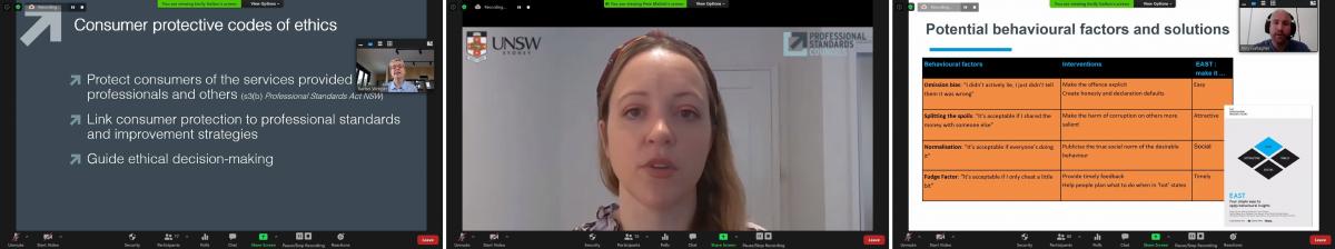 In the panel session, Dr Justine Rogers, Senior Lecturer at UNSW Law and Deputy-Director of the Law Society of NSW flip research stream, presented research on professional ethics and regulation from a consumer protection perspective. The Professional Standards Councils’ member from Western Australia, Ms Rachel Webber, shared insight into public perceptions of occupations’ ethical behaviour and introduced the Councils’ recent work to assist associations in developing consumer-centred codes of ethics. Managing Director Australia and Asia-Pacific with The Behavioural Insights Team, Dr Rory Gallagher, presented a behavioural perspective on promoting ethics and ethical decision-making.