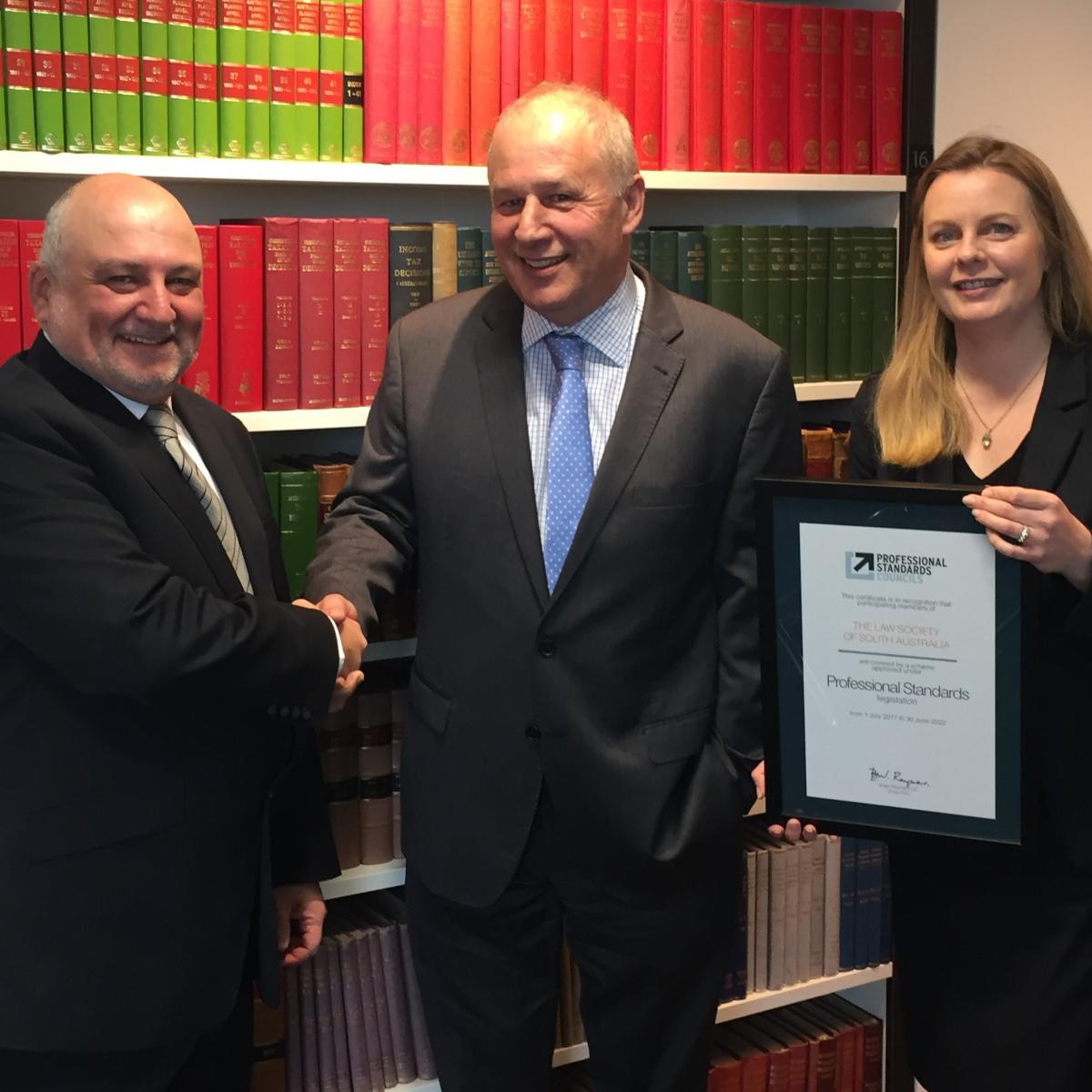 On Monday 7 August, CEO Dr Deen Sanders OAM, presented the certificate to LSSA's Chief Executive, Stephen Hodder, and the Professional Standards Scheme Manager, Mia Bell, at the Law Society CEO's annual meeting in South Australia.